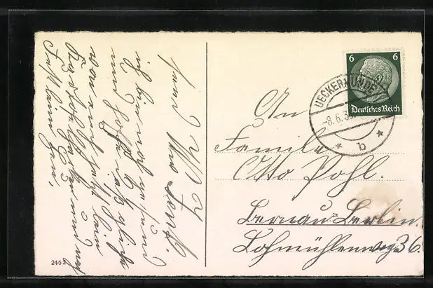 Personenbezogene Daten auf der Rückseite der Karte wurden durch blauen Textmarker unkenntlich gemacht. Die blauen Stellen sind auf die Vorderseite durchgeweicht und wirken sich negativ auf das Postkartenfoto aus