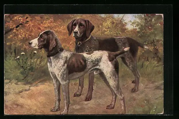 Künstler-AK Zwei Münsterländer auf einer Waldlichtung
