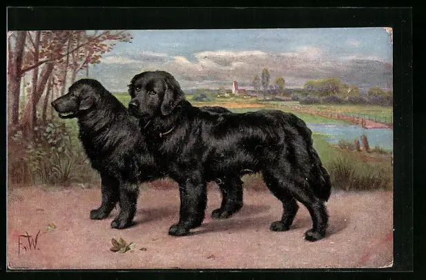 Künstler-AK Zwei Neufundländer vor Landschaft