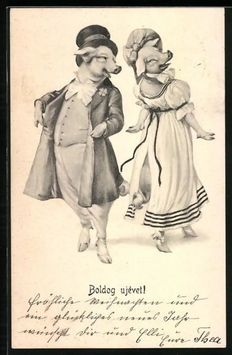 Künstler-AK Zwei Schweine in edler Kleidung