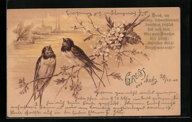 Künstler-AK Zwei Singvögel auf einem blühenden Zweig