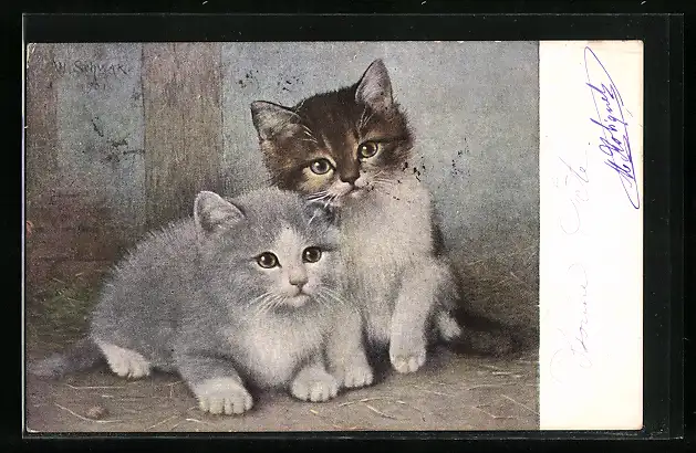 Künstler-AK Zwei niedliche Schmusekätzchen