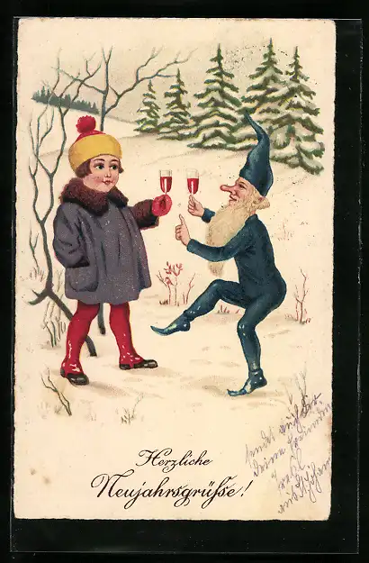 Künstler-AK Zwerg stösst mit junger Frau zu Neujahr an