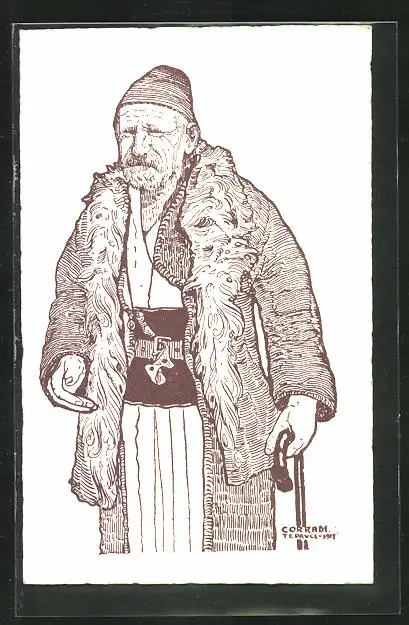 Künstler-AK betagter Herr in Mantel am Gehstock