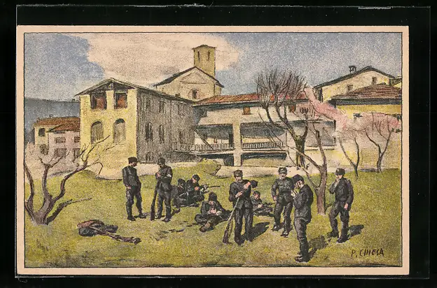 Künstler-AK schweizer Soldaten auf einer Wiese