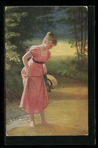 Künstler-AK sign. Adolf Hering: Am Bachesrand, Dame steht im Bach