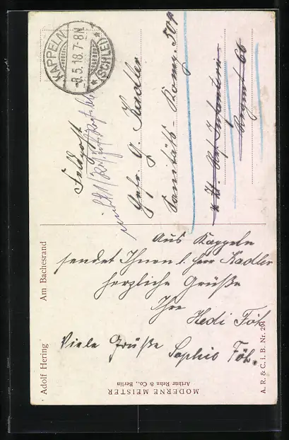 Personenbezogene Daten auf der Rückseite der Karte wurden durch blauen Textmarker unkenntlich gemacht. Die blauen Stellen sind auf die Vorderseite durchgeweicht und wirken sich negativ auf das Postkartenfoto aus