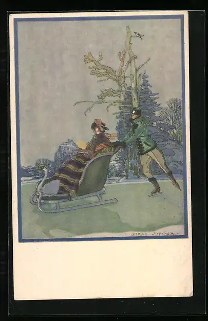 Künstler-AK sign. Bernd Steiner: Eisläufer schiebt Frau auf einem Schlitten