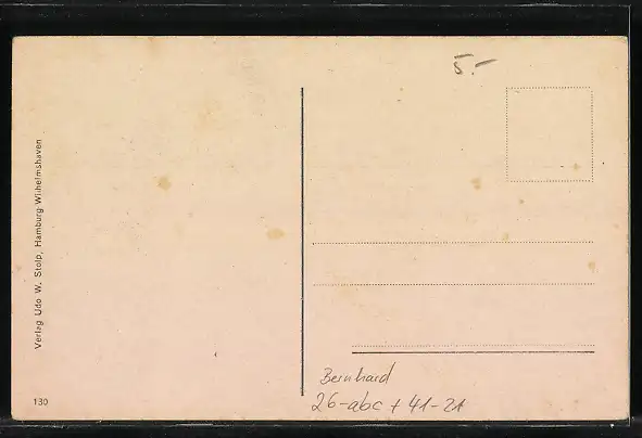 Personenbezogene Daten auf der Rückseite der Karte wurden durch blauen Textmarker unkenntlich gemacht. Die blauen Stellen sind auf die Vorderseite durchgeweicht und wirken sich negativ auf das Postkartenfoto aus