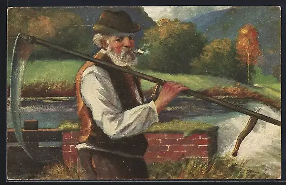 Künstler-AK sign. Büger: Bauer mit Tabakpfeife und Sense