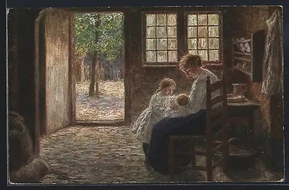 Künstler-AK sign. Carl Priem: Mutterglück, Mutter mit ihren zwei Kindern