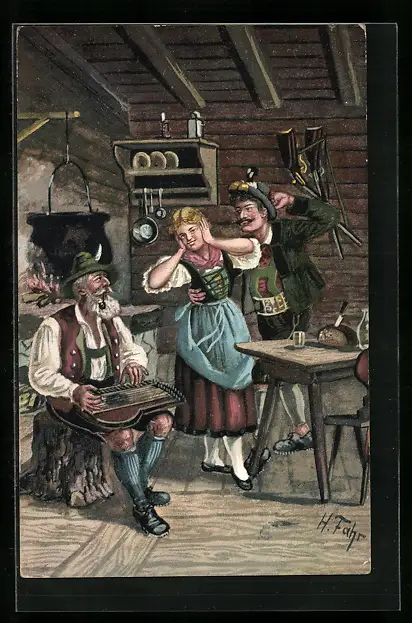 Künstler-AK sign. E. Fahr: Dem Paar gefällt das gezither des Opas nicht