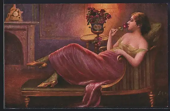 Künstler-AK sign. E. Otto: Süsser Duft, Frau sitzt mit einer Rose auf einem Sofa