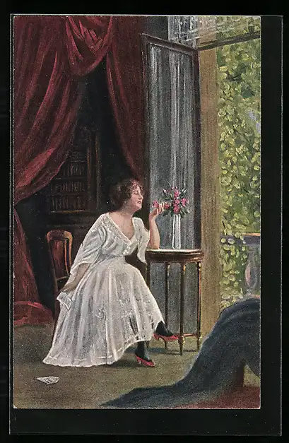 Künstler-AK sign. E. Uhlig: Frau am Tisch riecht an Rosen