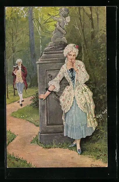 Künstler-AK sign. Elmi: Überraschung, Frau versteckt sich vor ihrem Liebsten hinter einer Amorstatue