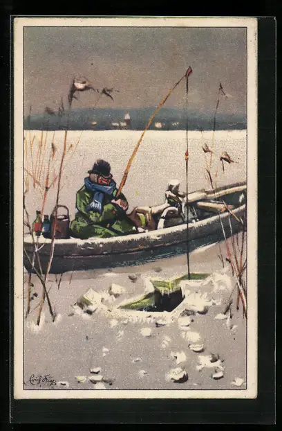 Künstler-AK sign. Erich Kux: Der Angler, Herr beim Eisangeln