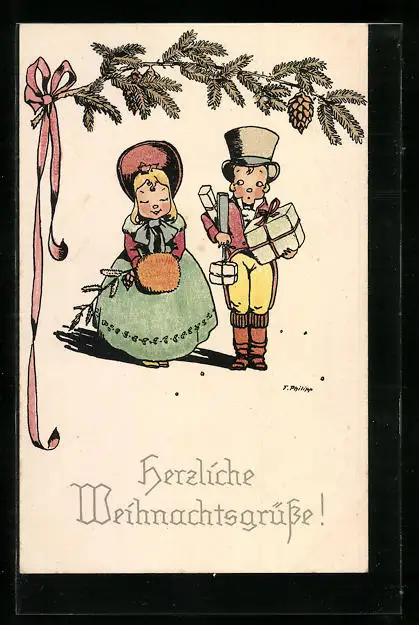 Künstler-AK sign. F. Philipp: Kleines Paar mit Weihnachtseinkäufen