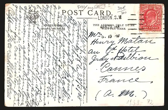 Personenbezogene Daten auf der Rückseite der Karte wurden durch blauen Textmarker unkenntlich gemacht. Die blauen Stellen sind auf die Vorderseite durchgeweicht und wirken sich negativ auf das Postkartenfoto aus