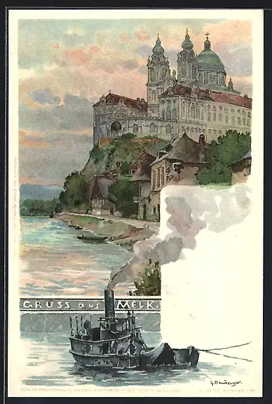 Künstler-AK sign. G. Bamberger: Melk / Donau, Stift, Dampfer