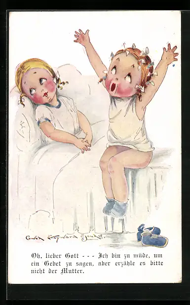 Künstler-AK sign. Gwen Hayward Young: Oh, lieber Gott - Ich bin zu müde, um ein Gebet zu sagen...
