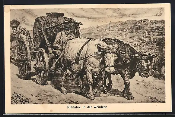 Künstler-AK sign. H. Strieffler: Kuhfuhre in der Weinlese