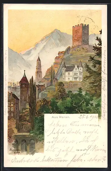 Künstler-AK sign. Hirschmann: Meran, Teilansicht aus der Vogelschau