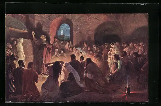 Künstler-AK sign. Jan Styka: Der Apostel Petrus predigt in den Katakomben