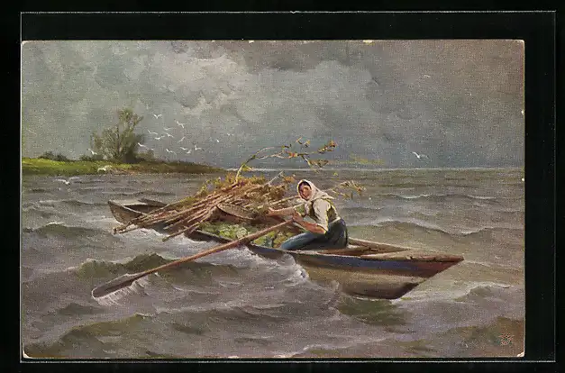 Künstler-AK sign. K. Raupp: Frau im Boot vor dem Gewitter