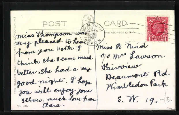 Personenbezogene Daten auf der Rückseite der Karte wurden durch blauen Textmarker unkenntlich gemacht. Die blauen Stellen sind auf die Vorderseite durchgeweicht und wirken sich negativ auf das Postkartenfoto aus