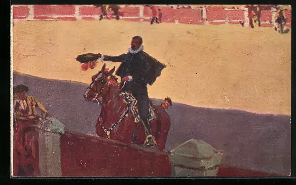 Künstler-AK sign. M. Bertuchi: Stierkämpfer zu Pferde nach erfolgreichem Kampf