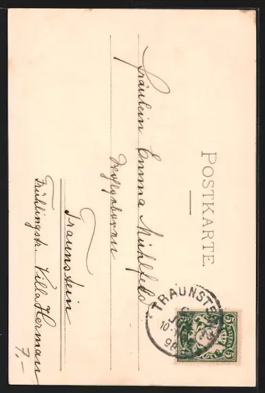 Personenbezogene Daten auf der Rückseite der Karte wurden durch blauen Textmarker unkenntlich gemacht. Die blauen Stellen sind auf die Vorderseite durchgeweicht und wirken sich negativ auf das Postkartenfoto aus