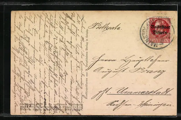 Personenbezogene Daten auf der Rückseite der Karte wurden durch blauen Textmarker unkenntlich gemacht. Die blauen Stellen sind auf die Vorderseite durchgeweicht und wirken sich negativ auf das Postkartenfoto aus