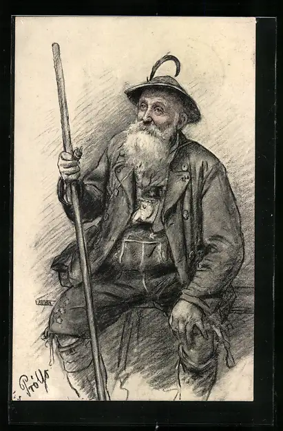 Künstler-AK sign.: Prölss, alter Mann mit Hut & Wanderstab