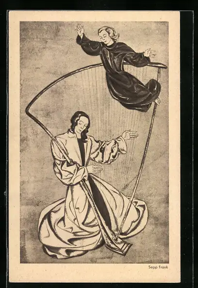 Künstler-AK sign. Sepp Frank: Engel schwebt über der Frau mit der Harfe