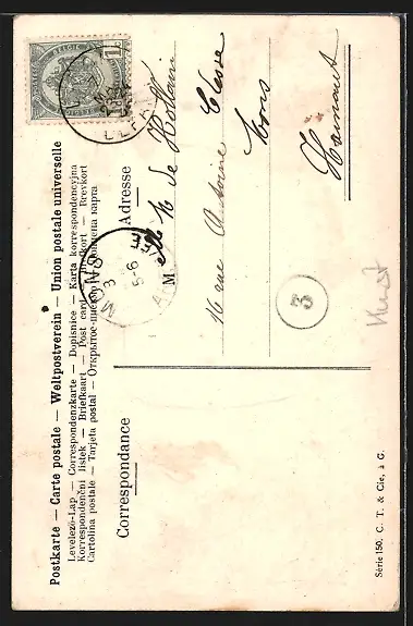 Personenbezogene Daten auf der Rückseite der Karte wurden durch blauen Textmarker unkenntlich gemacht. Die blauen Stellen sind auf die Vorderseite durchgeweicht und wirken sich negativ auf das Postkartenfoto aus