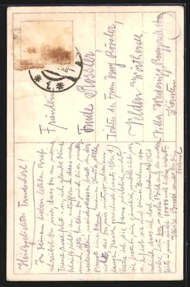 Personenbezogene Daten auf der Rückseite der Karte wurden durch blauen Textmarker unkenntlich gemacht. Die blauen Stellen sind auf die Vorderseite durchgeweicht und wirken sich negativ auf das Postkartenfoto aus