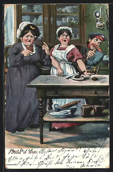 Künstler-AK zwei Dienstmädchen und ein Mann in Uniform, überrascht guckend