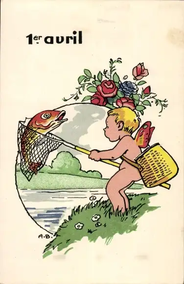 Künstler Ak 1. April, Junge fängt einen Fisch