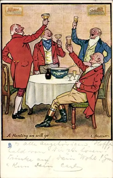 Künstler Ak A Hunting we will go, Männer einer Jagdgesellschaft, Punsch