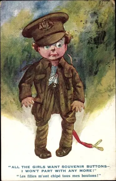 Künstler Ak All the girls want souvenir buttons, britischer Soldat