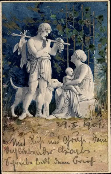 Künstler Ak Antikes Griechenland, Mutter, Kind, Mann, Hund, Jäger