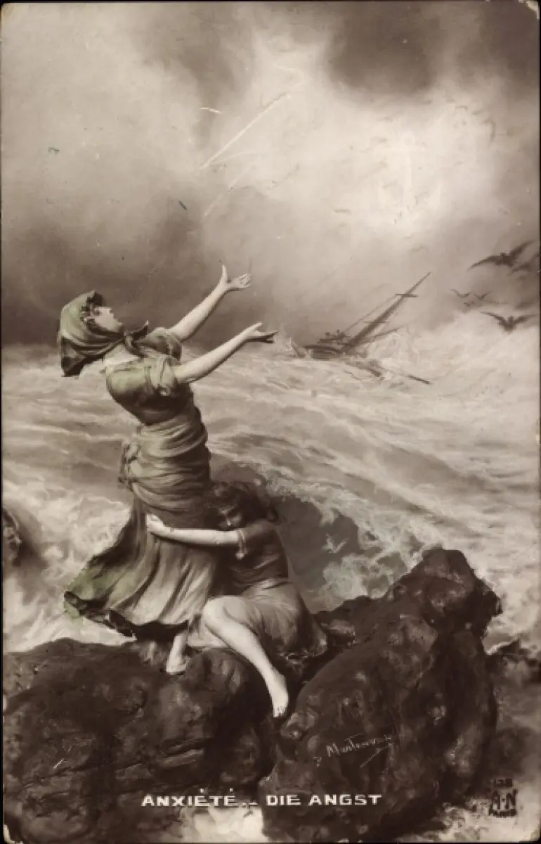 Künstler Ak Anxiete, Die Angst, Frau mit Kind auf dem Fels, Sturmkatastrophe, Schiff