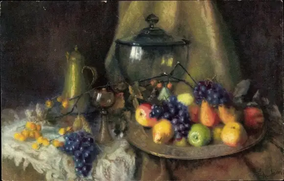 Künstler Ak Arnheim, E., Stillleben Früchte, Obst, Weintrauben, Birnen