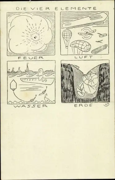 Künstler Ak Arnold, Karl, Liller Kriegszeitung, die vier Elemente, Zeppelin, U Boot, Schützengraben