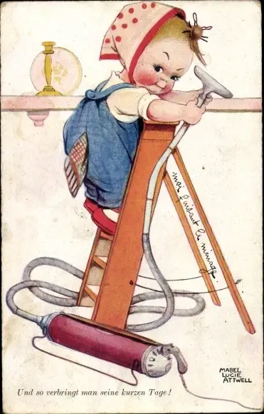 Künstler Ak Attwell, Mabel Lucie, Mädchen mit Staubsauger