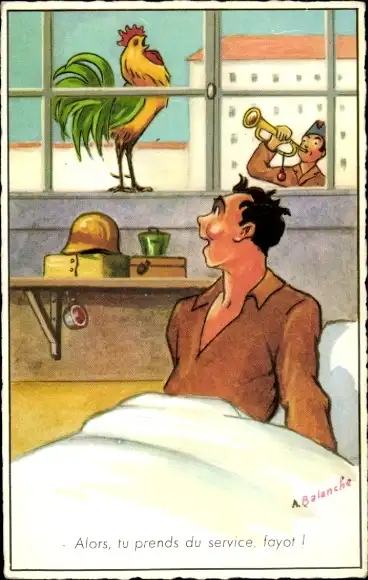 Künstler Ak Balanche, Soldat wird von Hahn und Trompete geweckt