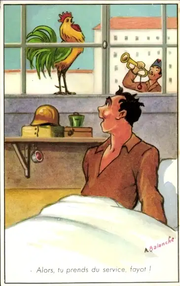 Künstler Ak Balanche, Soldat wird von Hahn und Trompete geweckt