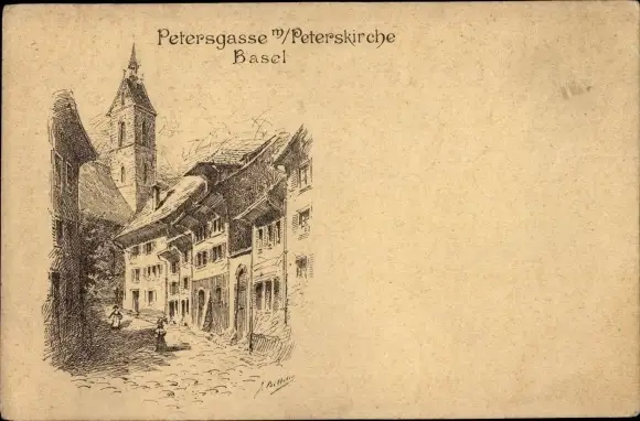 Künstler Ak Bâle Basel Stadt Schweiz, Petersgasse mit Peterskirche