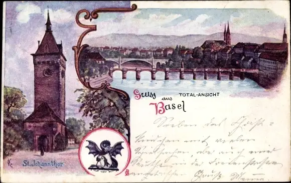 Künstler Ak Bâle Basel Stadt Schweiz, St. Johannistor, Totalansicht, Drache