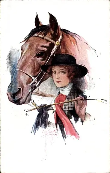 Künstler Ak Barber, Court, Frau in Reitkleidung mit Pferd